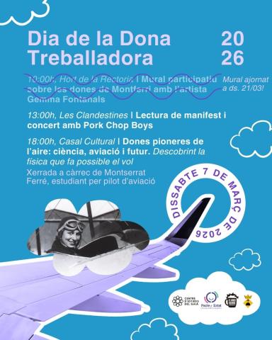 Dissabte 7 de març de 2026 commemorem el Dia de la Dona Treballadora! 10:00h a l'Hort de la Rectoria | Mural participatiu sobre les dones de Montferri amb l'artista Gemma Fontanals 13:00h a Les Clandestines | Lectura de manifest i concert amb Pork Chop Boys 18:00h al Casal Cultural | Xerrada "Dones...