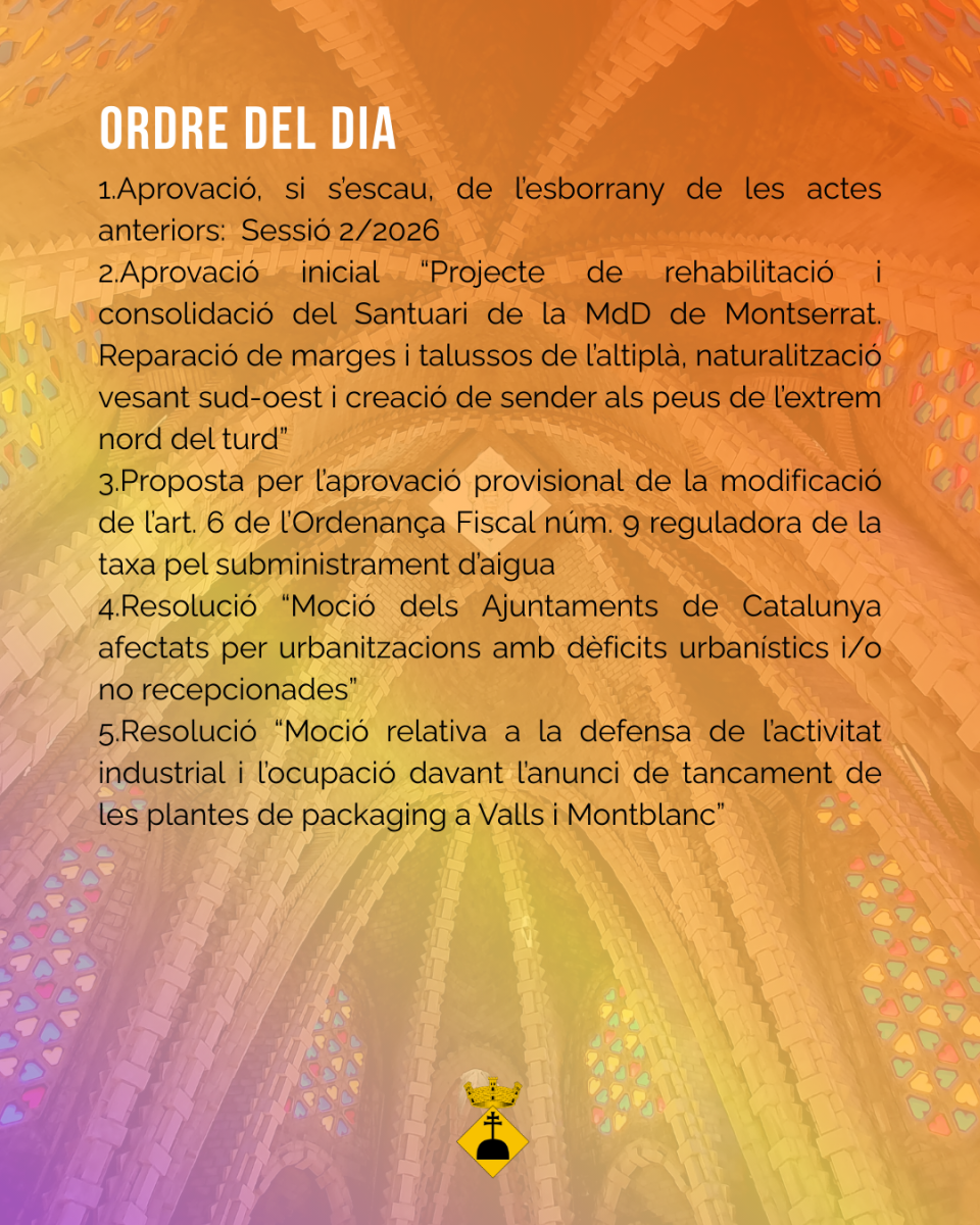El proper dimarts 10 de març hi haurà sessió de Ple a l'Ajuntament de Montferri